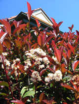 (Red Leaf Photinia) Features: Small white flowers in clusters. Bronze red re-growth. Fast growing. Form: Tall dense shrub to 10m. Aspect: Full sun to part shade. Soil: Moist drained clay or sandy soils. Growing: Flowers in Winter. Feed in Autumn and Spring. Prune regularly for dense growth.